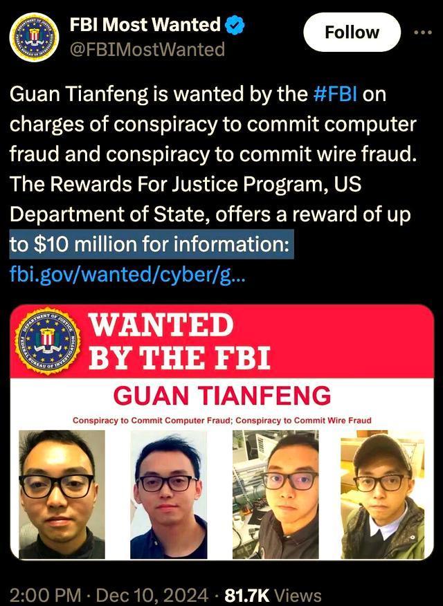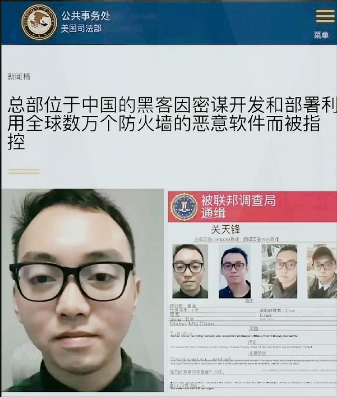 2024年12月,我国另一位名叫关天峰的男子同样遭到美国财政部、司法部和联邦调查局联合通缉,悬赏金额高达7000万元人民币,并被标记为“全球网络安全威胁极高人员”。
