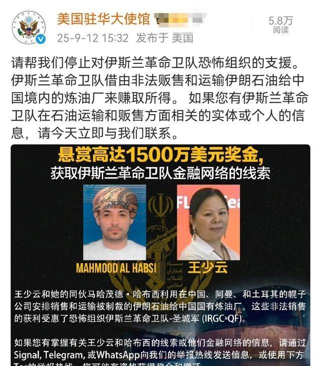 2025年9月12日,美国驻华大使馆发布了一项公告,宣布悬赏数千万人民币通缉一名中国女性。