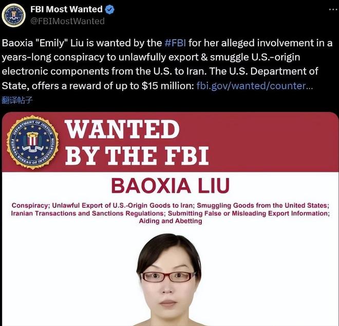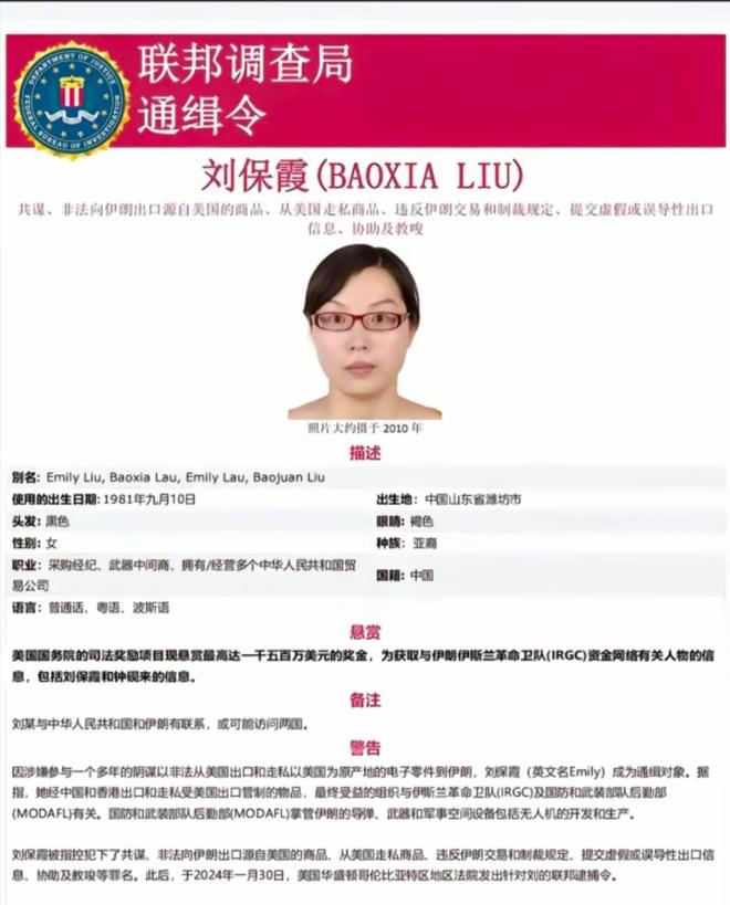 到了2025年3月19日,美国联邦调查局发布通缉令,理由是“非法出口无人机技术”,实质上是认为刘宝霞的行为违反了美国出口管制法规,威胁其。