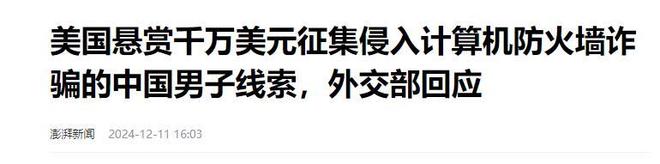 信息来源:美国悬赏千万美元征集侵入计算机防火墙的中国男子线索,外交部回应